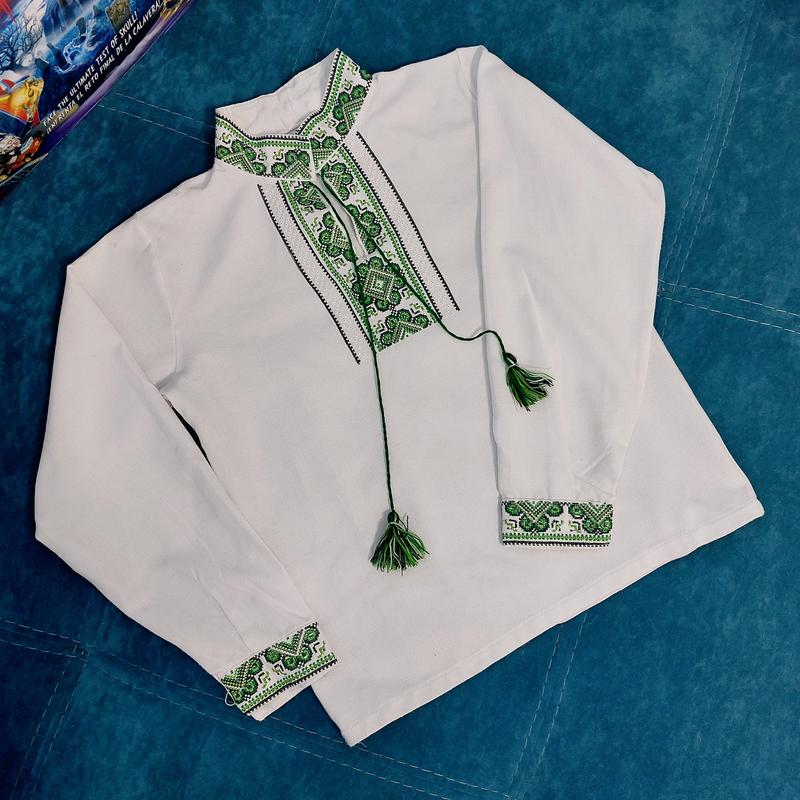 Вышиванка в идеальном состоянии, как новая. Белая с зелеными кистями. Купили на Прикарпатье. Длина от плеча 51 см ПО груди 42см Рукав от плеча 50см Рукав от горловины 59см Плечи 34см В наличии много вещей на мальчика, смотрите другие Мои объявления. От трех вещей - скидка.