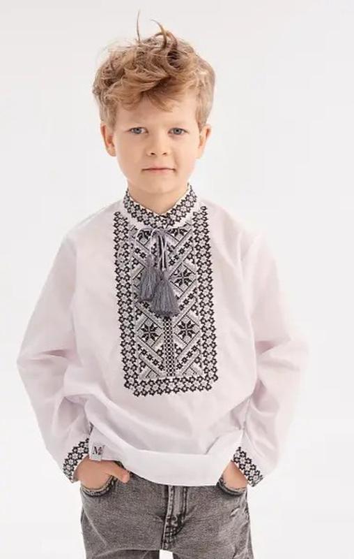 Вишиванка для хлопчика Розміри від 6 до 12 років (116 -152см). Тканина: поплін (65% бавовна, 35% поліестер). Колір вишивки: чорно-сіра Колір тканини - біла Вишивка машинна, хрестиком. На фото модель у розмірі 128. Зріст хлопчика 122 см. Краще брати на розмір більше від свого зросту. Вишиванка має бути вільна. Розмір "6" Ширина плеч - 30 см Довжина рукава від плеча - 41 см Довжина рубашки - 50 см ОГ - 78 см Розмір "7" Ширина плеч - 31 см Довжина рукава від плеча - 43 см Довжина рубашки - 53 см ОГ - 82 см Розмір "8" Ширина плеч - 31 см Довжина рукава від плеча - 44 см Довжина рубашки - 54 см ОГ - 84 см Розмір "9" Ширина плеч - 32 см Довжина рукава від плеча - 46 см Довжина рубашки - 56 см ОГ - 86 см Розмір "10" Ширина плеч - 33 см Довжина рукава від плеча - 48 см Довжина рубашки - 58 см ОГ - 88 см Розмір "11" Ширина плеч - 34 см Довжина рукава від плеча - 49 см Довжина рубашки - 59 см ОГ - 90 см Розмір "12" Ширина плеч - 36 см Довжина рукава від плеча - 49 см Довжина рубашки - 61 см ОГ - 92 см