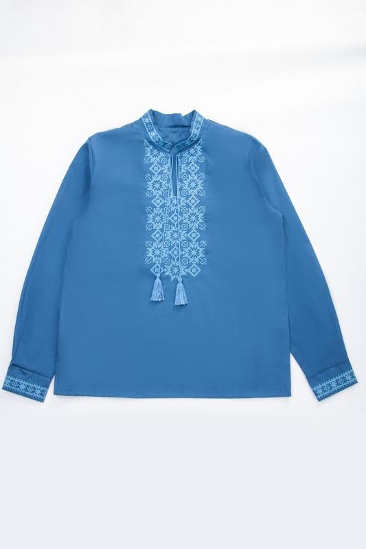 Вишиванка для хлопчиків з довгим рукавом виготовлена з полотна "Полікоттон". Полікоттон – зносостійкий, міцний матеріал, який довго прослужить, не втрачаючи свого первісного вигляду. У цій тканині гігроскопічність та повітропроникність бавовняних волокон доповнена практичним та міцним поліестером. Дана модель прямого крою, має комір-стійку, рукава та перед вишиванки прикрашений вишитим орнаментом. Полотно: полікоттон Склад: 75% бавовна, 25% поліестер. Вишитий орнамент: машинна вишивка