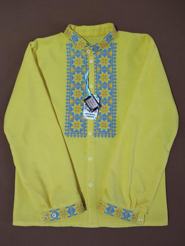Тканина натуральна, по типу льону. Застібка на кнопки, рукава на кнопках. Якісна машинна вишивка Розмір приблизно 140-152, дивіться заміри довжина сорочки 56см довжина рукава 53см ширина плечей 36см ширина сорочки 42см