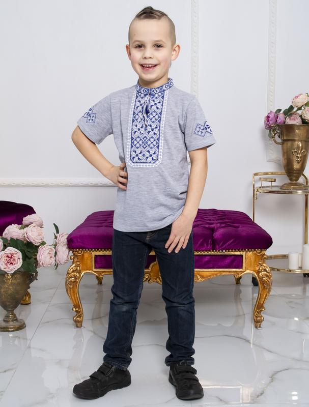 Вишиванка для хлопчика Іванко з коротким рукавом виготовлена з трикотажної тканини лакоста сірого кольору. Прикрашена вишивкою хрестиком синього кольору. Склад тканини: 65% - бавовна 35% - ПЕ Тканина: лакоста, трикотаж Вид вишивки: хрестик Уточнюйте, будь ласка, наявність. По розміру можу надати багато варіантів.
