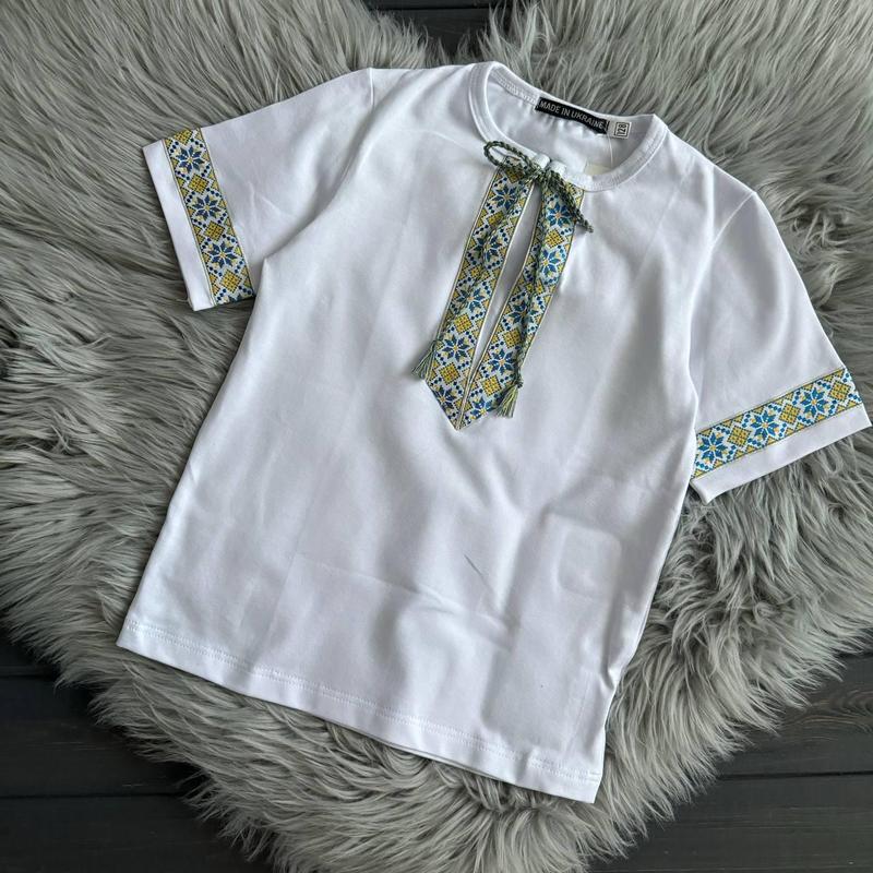 тканина: стрейч- кулір, 95% бавовни, 5% еластану футболка оздоблена жаккардовою стрічкою з українським орнаментом ВИМІРИ: р.122 довжина по спинці 46 плечі 30 пог 34см р.128 довжина по спинці 48 плечі 31 пог 35см р.134 довжина по спинці 50 плечі 32 пог 36см р.140 довжина по спинці 52 плечі 33 пог 37см р.146 довжина по спинці 54 плечі 34 пог 39см ВЛАСНЕ ВИРОБНИЦТВО! Кнопку КУПИТИ не тисніть, до уточнення деталей Безпечна доставка Нова пошта - наложний платіж з переплатою 150 грн Укрпошта - повна оплата
