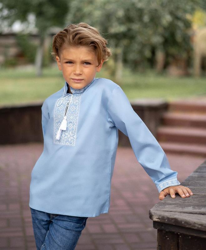 Вышиванка голубая для мальчика, рубашка рубашка вышитая, белая вышивка, вышиванка для маль...