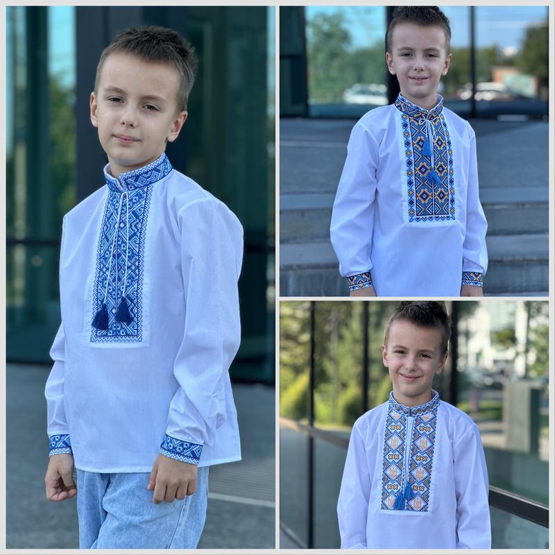 Вишиванка для хлопчика буде гарним одягом у святковий та буденний день. Вишиванка добре виглядає як із джинсами, так і з брюками будь-якого крою. Вона зшита з якісної тканини, має довгий рукав та комір стійку. Вишивка розташована на манжетах та грудях. Тканина - сорочкова (80% бавовна 20% поліестер) Розміри 6,7,8,9,10,11,12 років На 6 років довжина 46,5см, півобхват по грудям 37см , рукав 44см , плечі 30 см. На 7 років довжина 48см, півобхват по грудям 38см , рукав 45,5см , плечі 30 см. На 8 років довжина 49,5см , півобхват по грудям 39см , рукав 47 см , плечі 32см. На 9 років довжина 51см , півобхват по грудям 40см , рукав 48см , плечі 33 . На 10 р довжина 54см, по грудям півобхват 43см, рукав 49см , плечі 34 см. На 11 р довжина 56 см , по грудям півобхват 45см, рукав 51см , плечі 35 см На 12 років довжина 58 см, по грудям 46 см, рукав 52см , плечі 37см.
