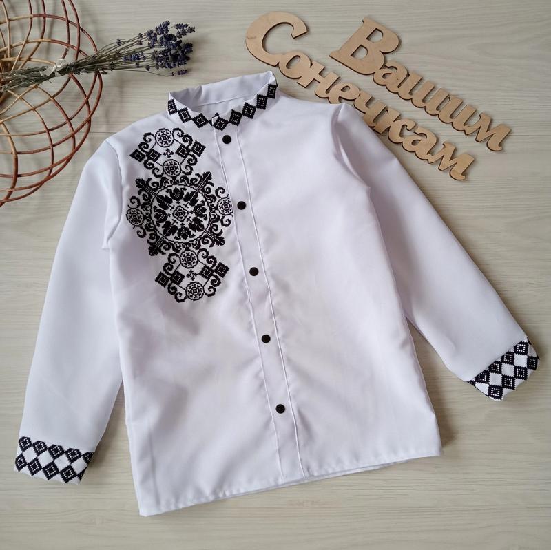 Стильная вышиванка выполнена черными нитями машинная вышивка тканина габардин закрывается на кнопки манжет тоже застежка на кнопке р10-11 р14-15 замеры произведены вручную допустимо+-2см замеры: длина изделия/рукав от плеча/ширина в груди, см 10-11: 60см/51см/44см 14-15: 66см/59см/46см