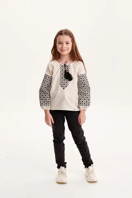 Состав ткани - 52% хлопок, 48% полиэстер Вишивка машинна, хрестиком На фото модель в размере 134 Рост девочки 128 см На последнем фото есть размерная сетка.