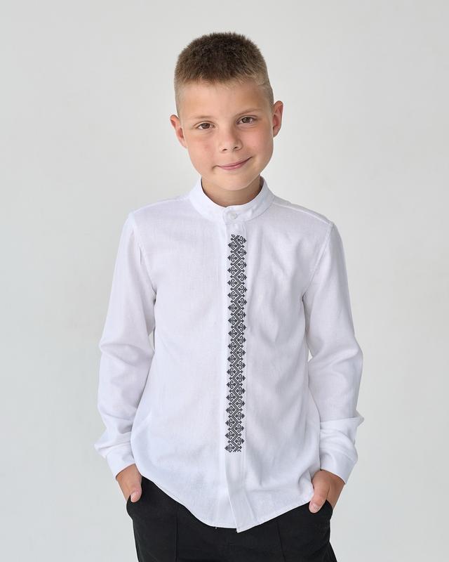 Сучасна вишита сорочка в мінімалістичному дизайні. Модель має комір стійку та застібку на потаємних гудзиках. Ідеальне поєднання кольорів нитки орнаменту та самого полотна. Виготовлена сорочка на полотні льон, ніжного молочного кольору. Сорочка, що неодмінно сподобається Вашому хлопчику та ідеально підійде для святкових подій Розмірний ряд: 116-158