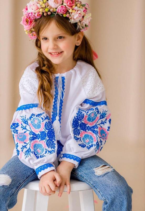 Вышиванка в хорошем состоянии, в голубо-розовых цветах, тканная домоткане полотно, Вышивка машинная Размер 146.(длина рукава от горловины 61 см Пог 43 см Длина 55 см.)