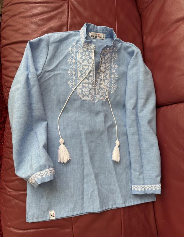 Вишиванка блакитна для хлопчика з білою вишиванкою/ Підійде на 8-11 років/ Не тягнеться,не щільна: У складі поліестер / Довжина 58 см/ Плечі 33 см/ Рукав 50,5 см/ Пог 44 см/ Пот 43 см/ Знизу 42,5 см/ З нюансів-плями жиру ,вивести можна спеціальним плямовивідником ,тому ціна нижче/ На фото вказано/ Продається без повернення. Деталі уточнюйте,щоб потім не було непорозумінь.