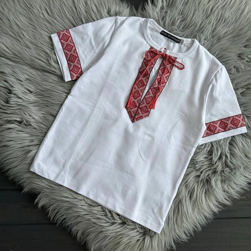 ткань: стрейч кулир, 95% бавовни, 5% еластану футболка украшена жаккардовой лентой с украинским орнаментом ВЫМЕРЫ: р.122 длина по спинке 46 плечи 30 пог 34см-в наличии р.128 длина по спинке 48 плечи 31 пог 35см-в наличии р.134 длина по спинке 50 плечи 32 пог 36см-в наличии р.140 длина по спинке 52 плечи 33 пог 37см-в наличии р.146 длина по спинке 54 плечи 34 пог 39см-в наличии ВЛАСНЕ ВИРОБНИЦТВО!