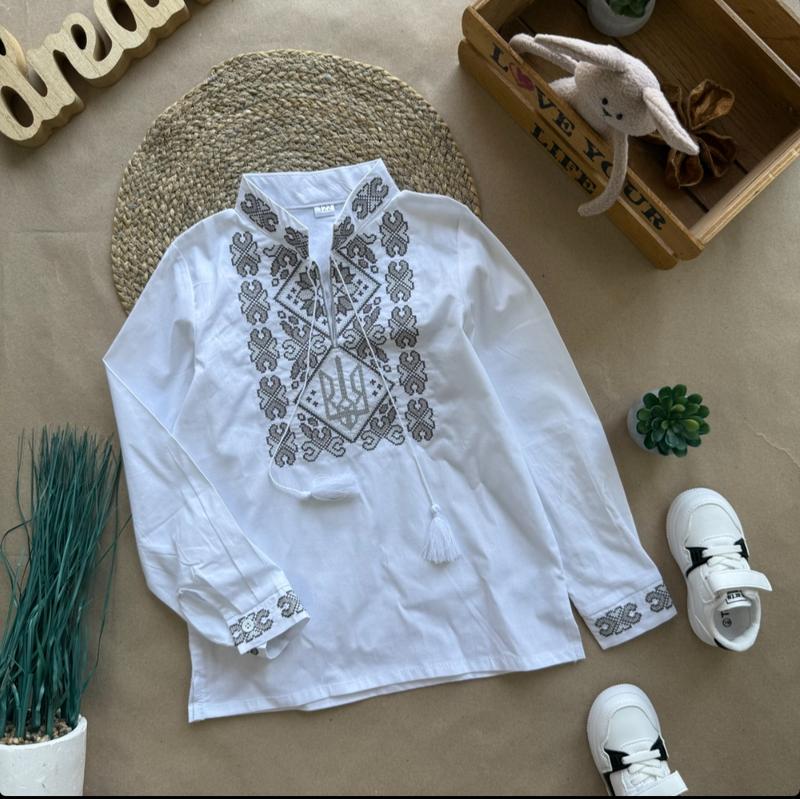 Описание Мальчишка вышиванка – производства Украина! Рисунок – вышивка нитками! Качество – отличное! Тканина – бавовна. Манжеты застегиваются на пуговицу и отделаны вышивкой. Размеры: 122 (болеемерит, реально ростом 128) – рукав 47/ длина 50/ полуобхват грудины 38 128 (болеемерит, реально ростом 134) - рукав 48/ длина 52/ полуобхват грудины 40 134 (болеемерит, реально ростом 140) - рукав 50/ длина 54/ полуобхват грудины 42 140 (болеемерит, реально на рост 146) - рукав 54/ длина 56/ полуобхват грудины 44 Цена: 765 грн КрохпельКа