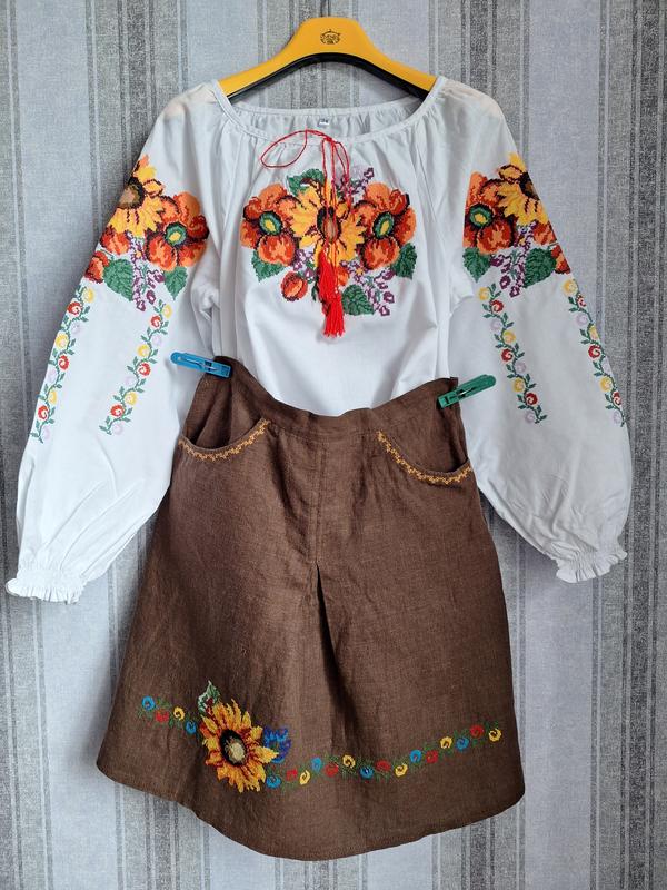 Оригинальный набор вышиванка. Рубашка и юбочка. Натуральная ткань. Размер на этикетке 32 ( младшая школа). Длина рубашки 55 см. Ширина под руками 44 см. Длина рукава 53 см. Длина юбки 44 см. Ширина по талии 32 см.