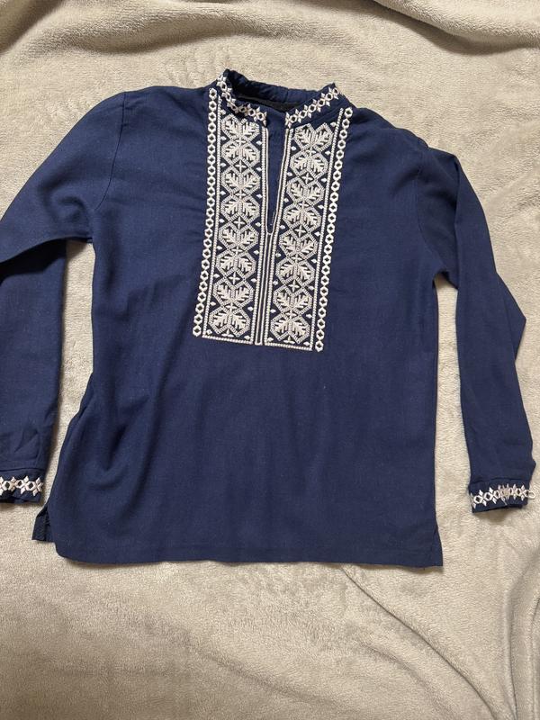 Вишиванка на хлопчика темно-синя. Вишивка машинна. На зріст 140 см. Воріт на ґудзиках стійкою.