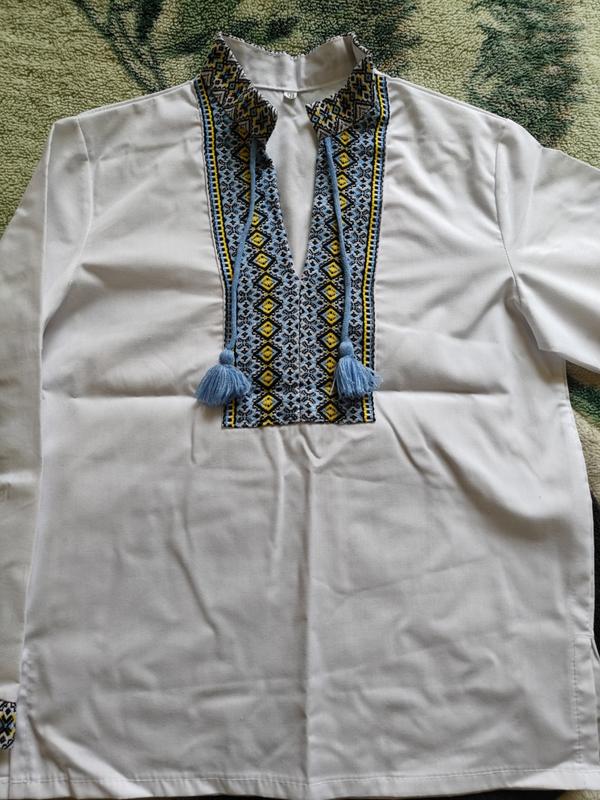 Красивая вышиванка на мальчика, одетая один раз. Никаких дефектов или пятен нет. Размер 128, но ориентироваться на замеры на фото.