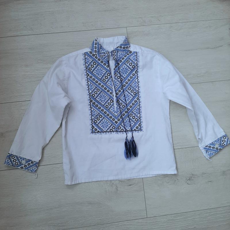 Вышиванка детская на мальчика ориентивно на 4-5 лет, нам до 6 р. подойдёт (зависит от телосложения ребенка) Пог 34 Плечи 30 Длина 40 Рукав 35 склад 100%бавовна состояние идеально! очень красивая вышивка крестиком