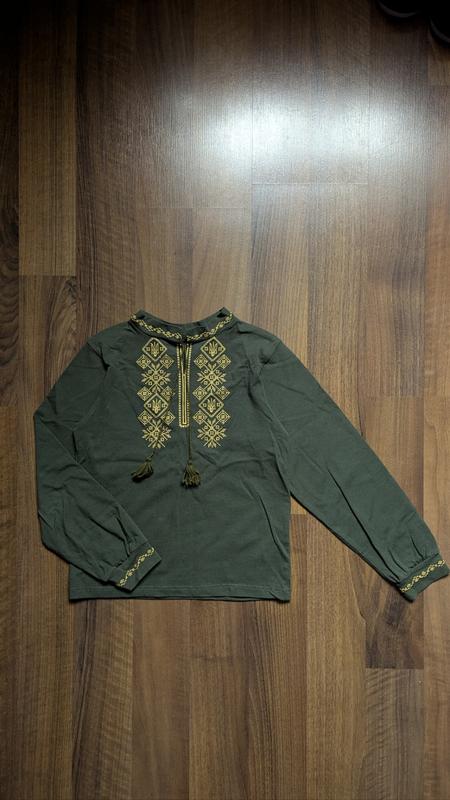 Трикотажная вышиванка, размер на 8-9р. рост 128/134см. Стан отличный, без нюансов. Замеры: длина 44см, под руками 35.5см, плечо 9см, рукав 47см