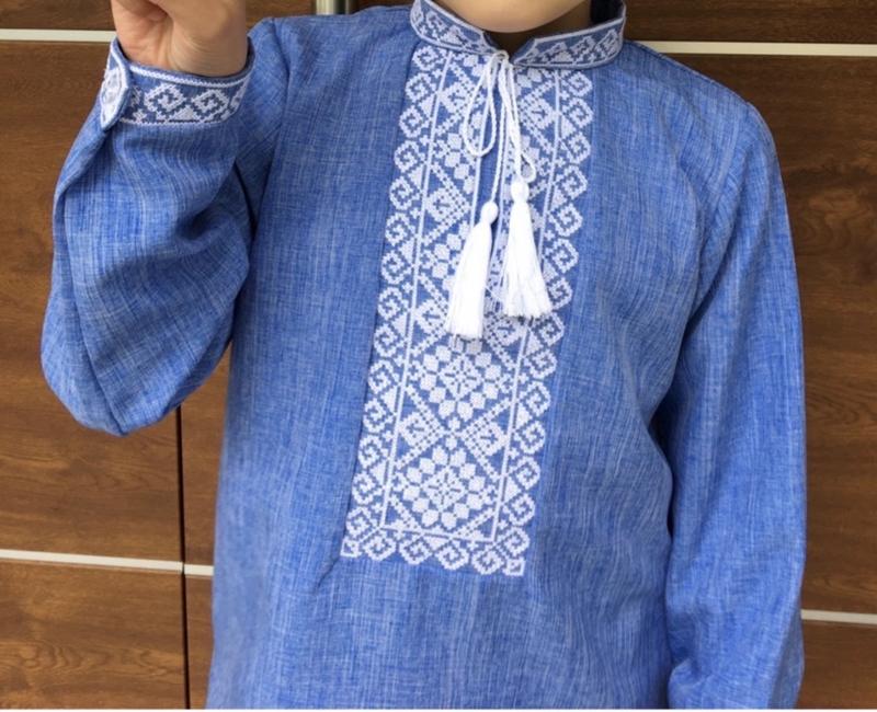 Блакитна дитяча вишиванка від бренду Merezhka з білою вишивкою та китицями. Основні характеристики: • Матеріал: поліестр • Колір: блакитний з білою вишивкою • Розмір: 132 (на зріст до 132 см) • Вік: підходить для дітей 6-7 років • Марка: Merezhka • Стан: одягали двічі Особливості: • Тонка, легка тканина • Якісне виконання • Традиційний орнамент з геометричними мотивами • Комір-стійка з вишивкою • Декоративні китиці на зав'язках • Вишивка на манжетах Вишиванка в відмінному стані, практично не носилась. Ідеально підійде для урочистих подій, фотосесій або як частина національного костюму.