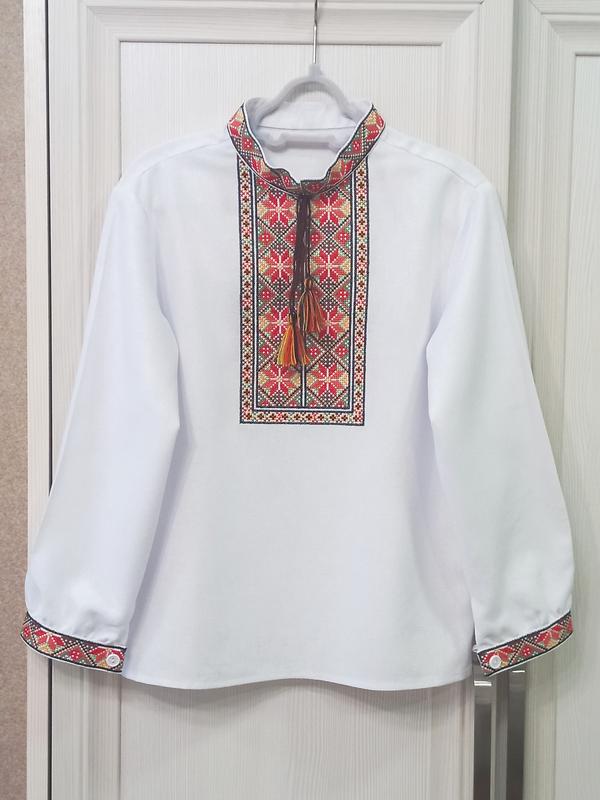Вышита крестом цветными нитями на белом тонком приятном к телу полотне. Замеры: Окружность шеи - 34см Окружность груди - 73см Плечи - 32.5см Длина рукава - 40см Длина рубашки - 47.5см В цену не входит Компрессовка на шкафу. На заказ выполняй в другом размере