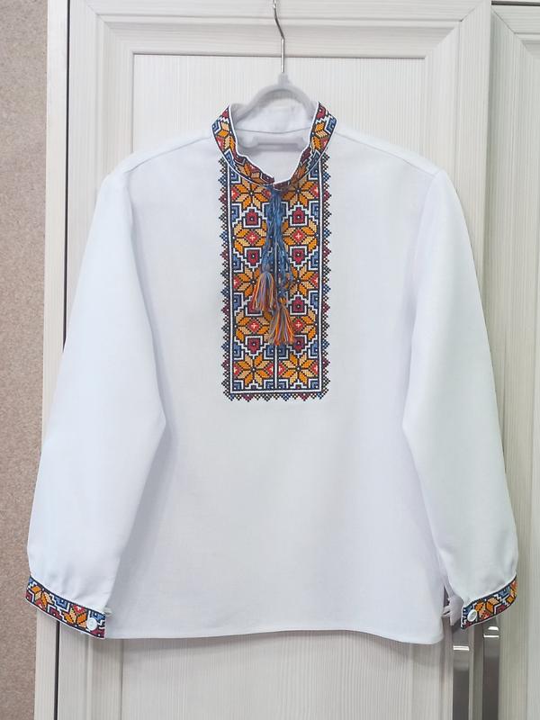 Вишита хрестиком кольоровими нитками на білому тонкому приємному до тіла полотні. Заміри: Окружність шиї - 31,5см Окружність грудей - 73см Плечі - 32см Довжина рукава - 40,5см Довжина сорочки - 48см В ціну не входить комісія на шафі. На замовлення виконаю у іншому розмірі