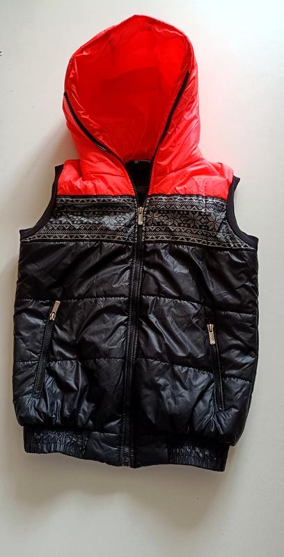 Яркий, стильный жилет. Выполнен из легкого и плотного материала - хорошо держит тепло Сочетание цветов и этническим орнаментом привлекает взгляд и красиво смотрится. Капюшон глубокий. Хорошо смотрится с худи, свитером или кофтинкой. Карманы на молниях, рукава отделаны резинкой. замеры: длина по спинке 58см. пройма (под рукавами)46 см. около 7 - 10 лет. состояние идеальное без повреждений и пятен.