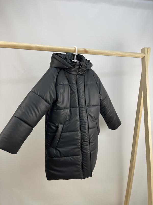 Зимний пуховик на флисе черный из плащевки черной под кожу до -30 мороза