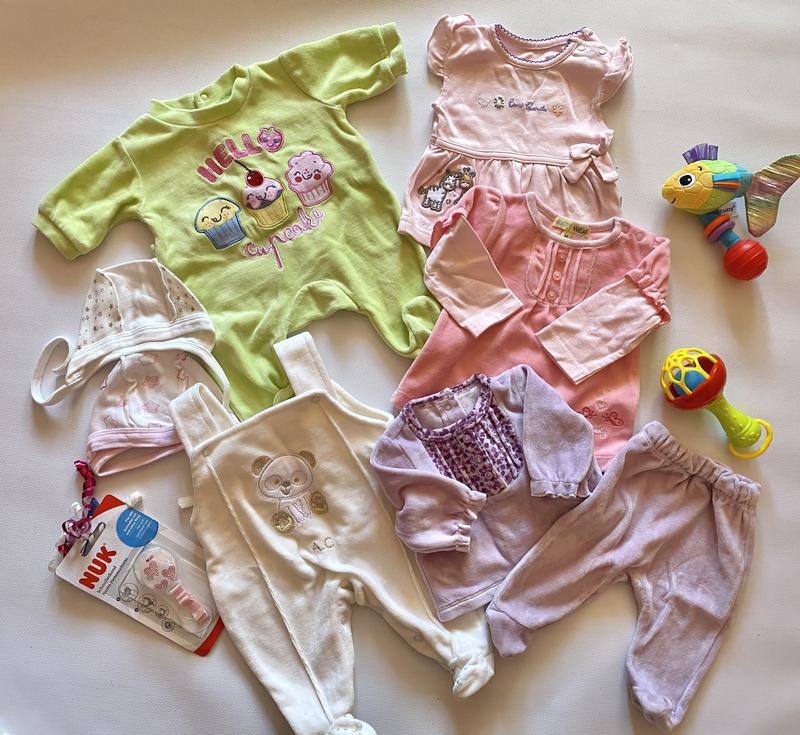 Розмір 50 на усіх речах, теплий фіолетовий костюмчик,теплі чоловічок, теплі повзунки,кофтинка рожева,блузочка-суконька,дві шапочки та подарунок-тримач новий для пустушки . Усі речі в ідеальному стані. Деякі не встигли поносити взагалі) (Продається без іграшок)