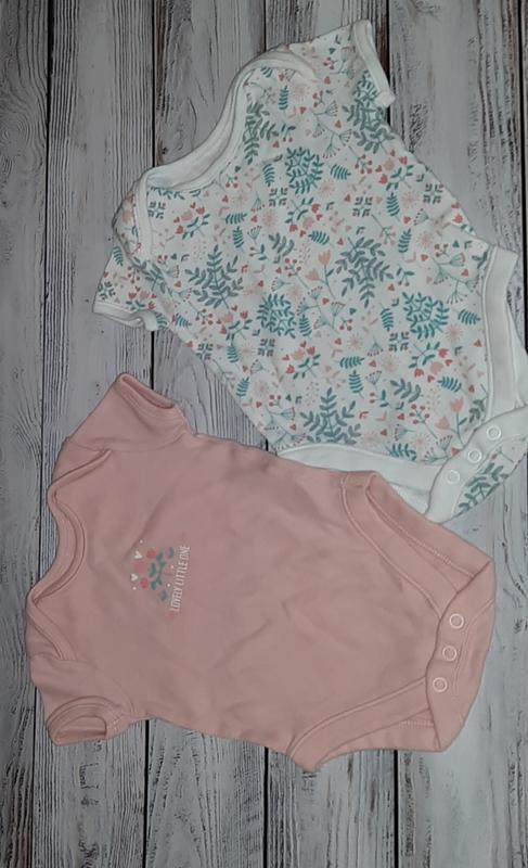 набір боді, 2шт., новенькі, не встигли поносити, бо маломірять, розмір вказаний 3-6м. довжина 30, ширина 20. один боді білого кольору, інший ніжно рожевого.