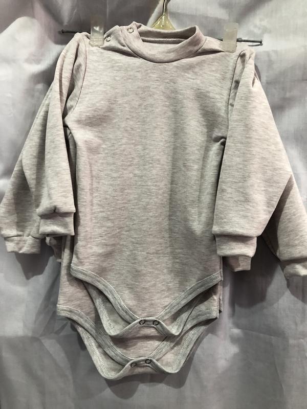 Боді з довгим рукавом. Защиплюється на плечі. Воротнічок стійка. На манжетах. Розмір. 74-80...86-92.