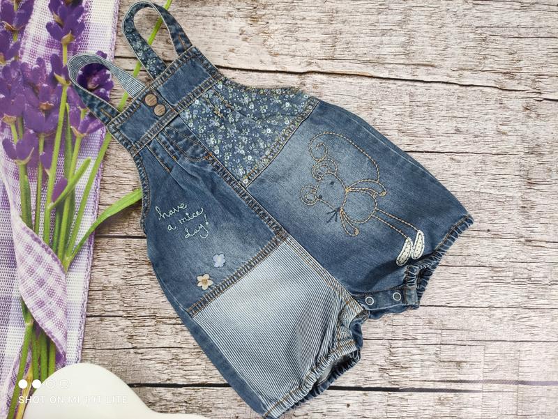 Комбинезон Next, размер 1,5-2 года длина 50 см. (в положении лямок как на фото) длина шорт 26 см длина комбинезона без бретелей 41 см ПОТ 27 см + сзади резинка шаг 6 см Между ножек кнопочки, что очень удобно. На ребёнке очень мило смотрится!!!