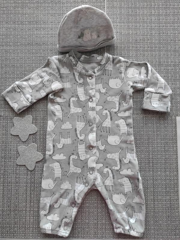 довжина від плеча до памперса 34 см. від плеча до ноги 45см. рукав 18см. ширина 21см. шапочка 35 см. ручки можна закривати. все в ідеальному стані.