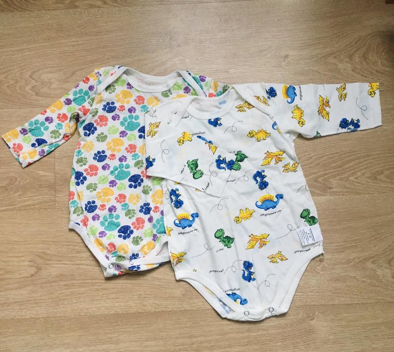 Один бодик новый с биркой (с динозавриками), второй постиран, но так и не одели Размер указан 74, но по факту немного большемерят, подойдут на рост 80 Легкая хлопковая ткань, можно использовать как пижамы для сна