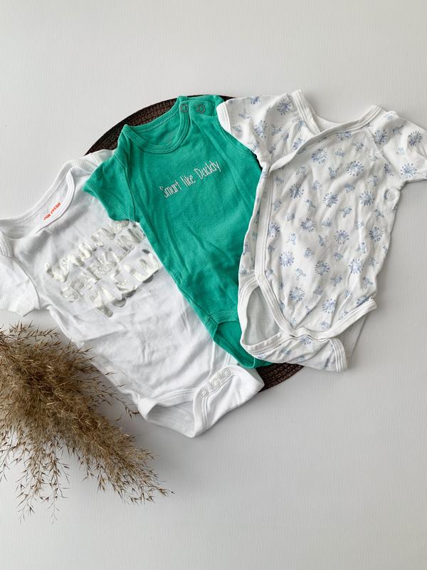 Два білих в ідеальному стані, зеленький - в дуже хорошому (трошки втратив колі) Вказані такі розміри: Перше боді - 0-3 міс Друге - 56 см Третє - 60 см Тому цей набір розрахований на перші місяці малечі