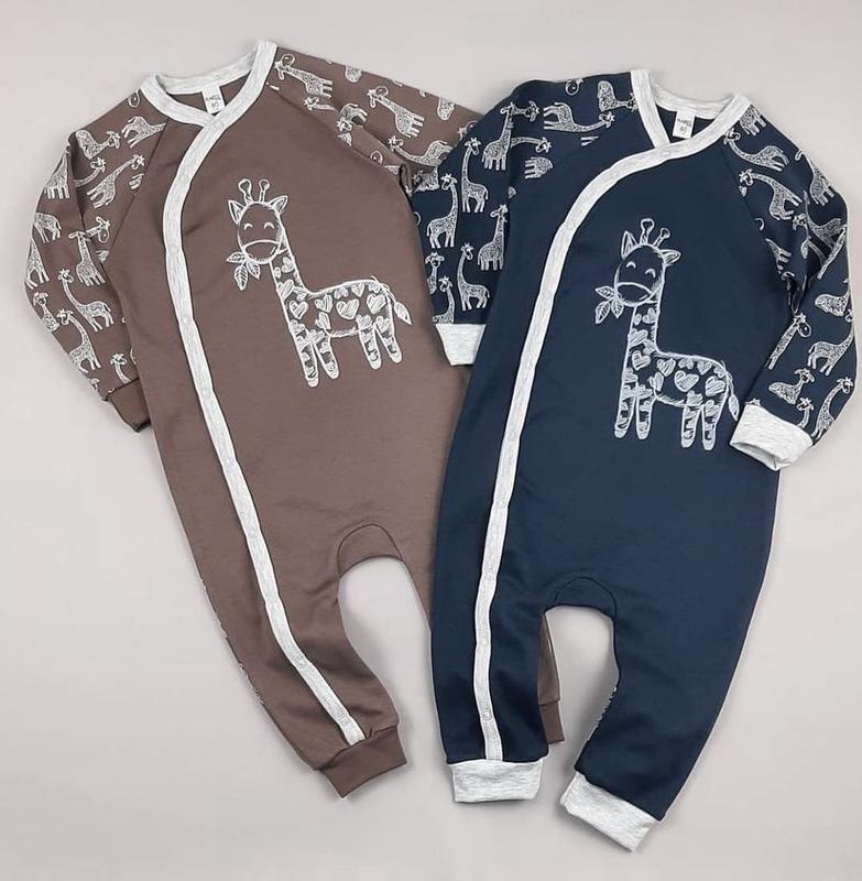 Чоловічок "жирафики", на манжетах, зі зручною застібкою на бік Тканина-інтерлок, 100% бавовна Коричневий: 80 86 Синій: 80 86