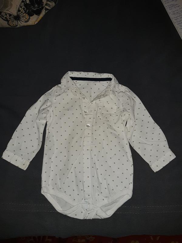 Стильний бодік на ріст 80-86см.Довжина виробу 36см, плечі 23см, ширина пахви 28см, рукав від плеча 28см.Є пятнышео на спині, при носінні не видно.Фото. Коттон.