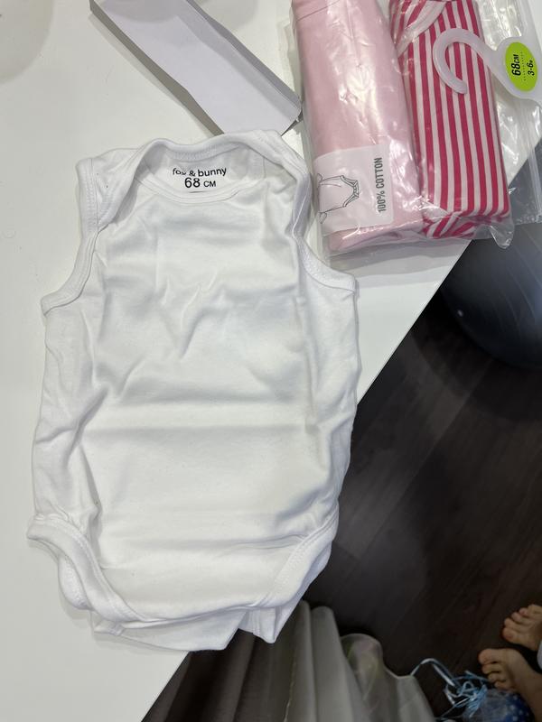 Новий набір, у наборі було 4 шт, використали лише 1 шт. продаю тільки НОВІ. Боді у формі маєчки.