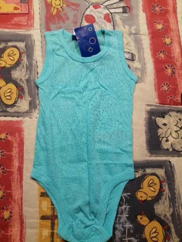 Симпатичный бирюзовый бодик. Унисекс. Пожилой, почти просвечивается. Товар новый, привезенный из Германии.