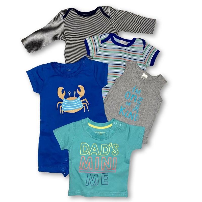 Всі речі в ідеальному стані. Розмір 62-68. Разом п'ять позицій: бодік на довгий рукав (62); бодік-футболка, новий, не одягався жодного разу (62/68); майка-бодік (74); пісочник-краб (68); футболка з надписом, новесенька, подарували вже малу на сина (62).