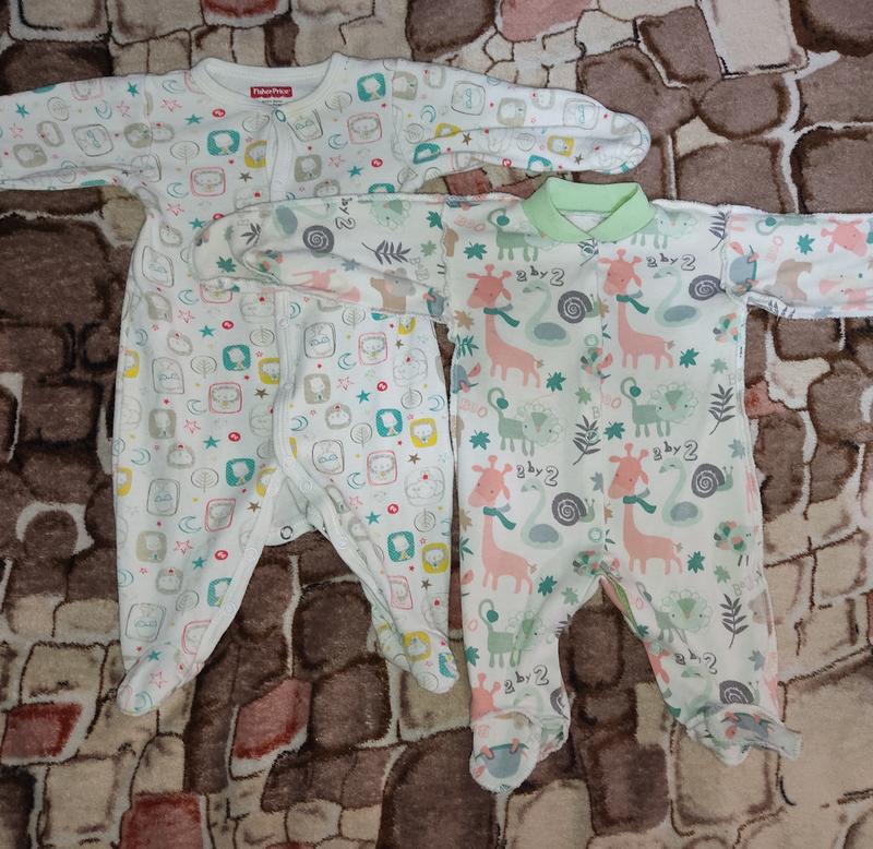 Котон. Оба от 0 до 3х месяцев, но с зеленым воротничком немного меньше, а другие носили вплоть до рны). Ціна за 2. Менший: длина 35 см, плечи 19 см, рукав 14 см. Больше : длина 41 см, плечи 17 см, рукав 18 см. На большем есть маленькая пятнышка на вороте (последнее фото). Смотрите другие Мои объёмы, там много интересного. Как делаете несколько покупок, You скидки)).