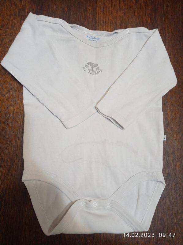 Минимальный заказ у продавца на 100 грн. Белый бодик AZIZ baby с длинным рукавом в нормальном состоянии. Есть пятно, выводить не пробовала, на фото видно. Модель 1384