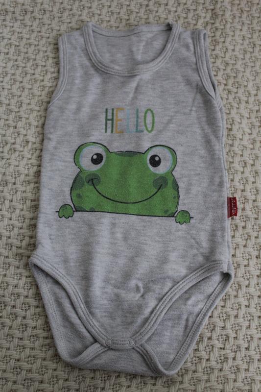 Детский боди без рукавов. Ткань плотная, поэтому ее можно поддевать под одежду в более прохладную погоду. Производство Турция. Есть следы ношения в виде катышков, но в целом состояние очень хорошее, без пятен и повреждений ткани.