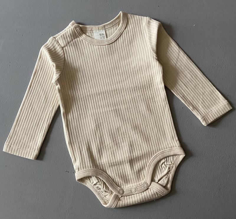 Класичний боді в рубчик для немовля з довгими рукавами. Застібка на кнопках: по низу боді та потайна на одному плечі. Розмір 62-68см ( 4-6 міс) 100% бавовна.