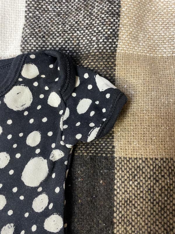 Удобный и качественный боди черного цвета с белыми кружочками. Можно носить как девочке, так и мальчику. До 6 месяцев