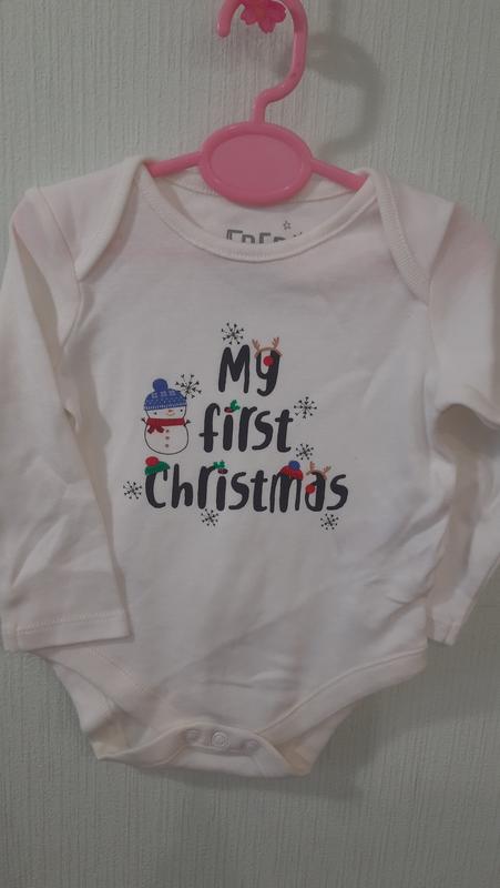 Новенький новогодний бодик на ребенка 0-3мес. Длина по спинке 32см.,длина рукава с плечом 25см, ширина подмышками 22см.