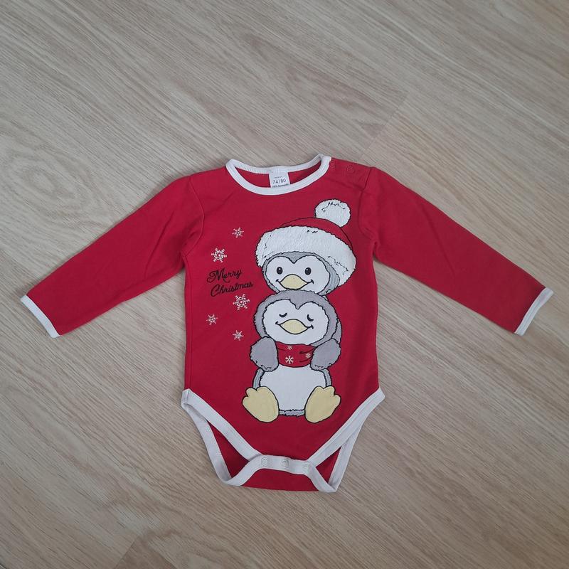Боди с длинным рукавом на новогоднюю тематику. Украшен аппликацией пингвинов, на плече кнопки. Состояние очень хорошее, будет +/- на 74см