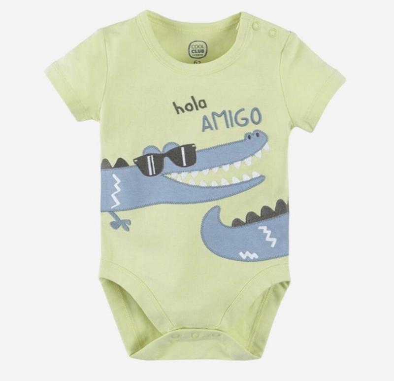 Детское боди-футболка для мальчика Cool club. С оригинальным дизайном, в пастельном оттенке светло-зеленого цвета. Имеет застежки на кнопках для удобного надевания. Размер 74 см