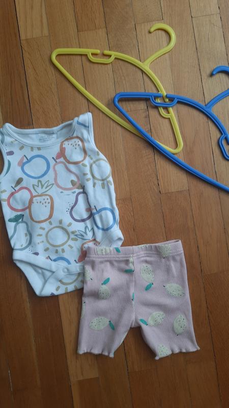 Новенький комплект для ребенка от 0-3мес. Длина боди по спинке до памперса 30см, ширина подмышками 21см. Длина шорт с резинкой до низа 20см, длина с резинкой до памперса 14см, талия 17см.
