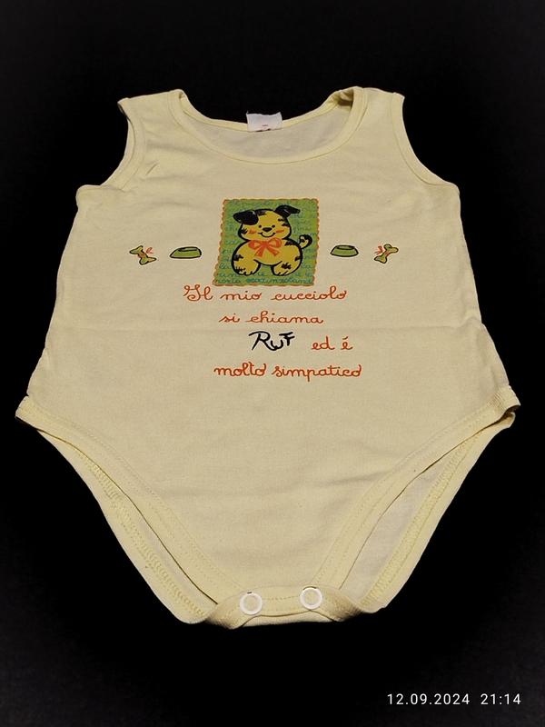 Минимальный заказ у продавца на 100 грн. Симпатичный бодик жёлтого цвета в отличном состоянии на ребёнка 3-6 месяцев. Длина изделия по спинке от плеча 45 см, полуобхват груди 24 см. Ткань хлопок, тянется. Модель 4797Д