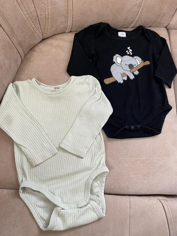 Набор боди, чёрный 3-6 мес, зеленый 6-9 мес ( камера не передает цвет, на последнем фото,цвет более похож на реальный). Зеленый боди в рубчик немного маломерит.