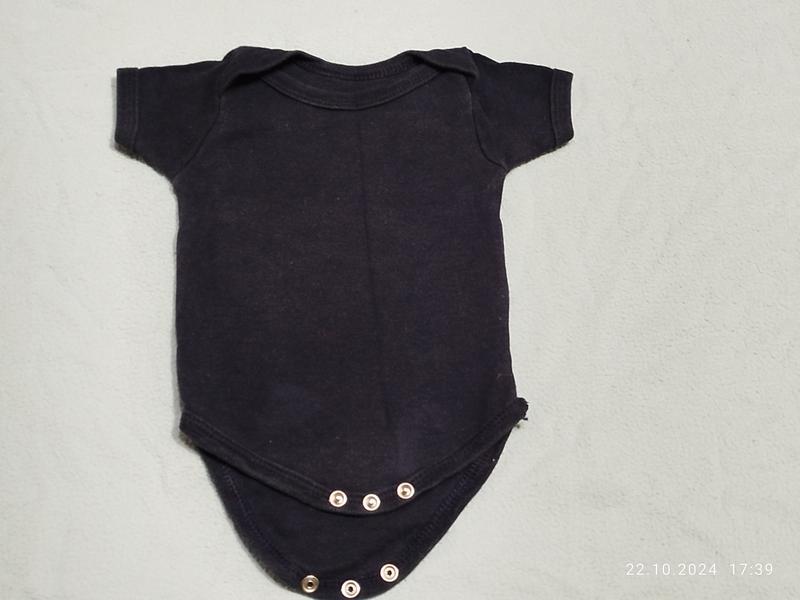 Минимальный заказ у продавца на 100 грн. Однотонный бодик тёмно-синего цвета с коротким рукавом в очень хорошем состоянии на новорожденного малыша до трёх месяцев. Длина изделия по спинке от плеча 33 см, полуобхват груди 19 см. Ткань хлопок, тянется. Модель 5327Д