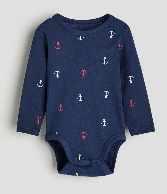 Боди с длинным рукавом из сверхмягкого хлопкового трикотажа от бренда H&M. Состав: 100% органический хлопок. Цена за 1шт. Является синий с воротником и зеленый дино размер 6-9м. Синий в якорь 9-12мес.